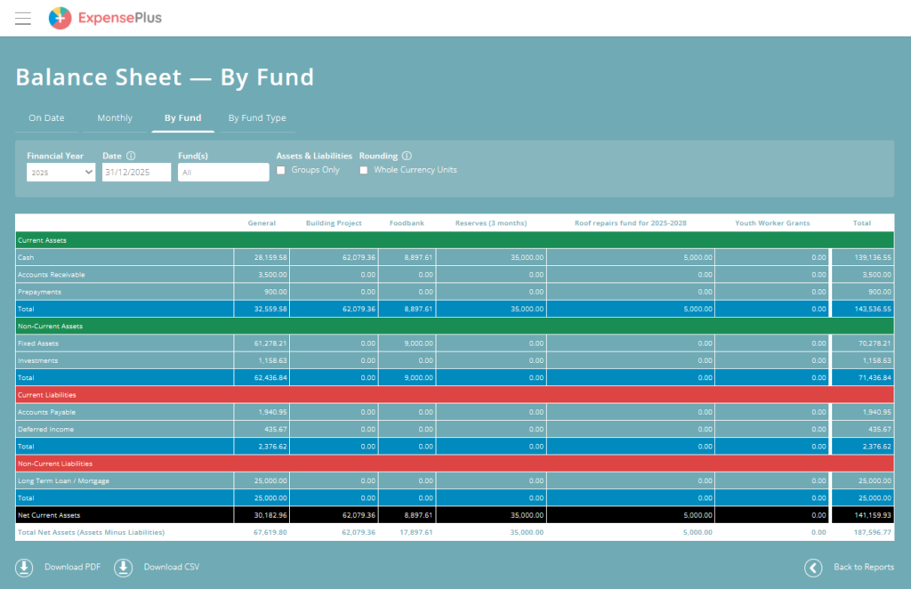 - Balance Sheet by fund – helps show the breakdown of assets and liabilities between funds.
