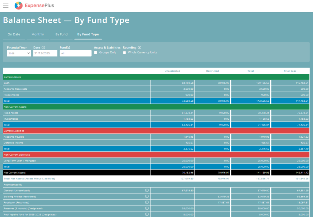 The total net assets of all funds must always equal the total net assets of the organisation shown in the balance sheet.
