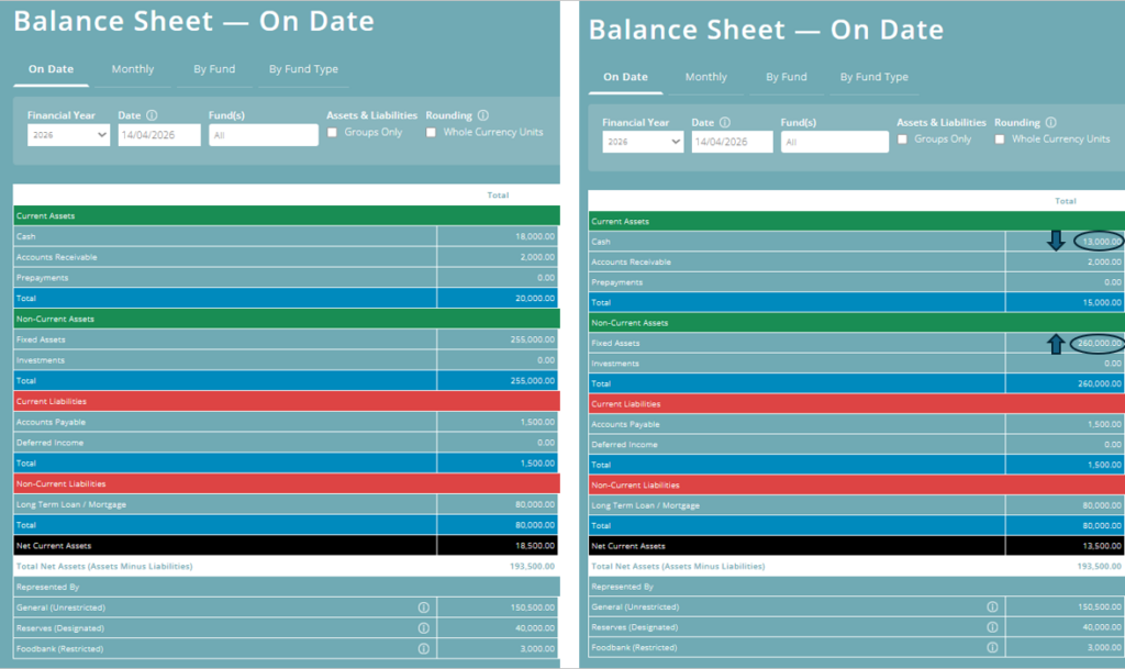 The purchase of a fixed asset doesn’t change the overall net assets of a charity.