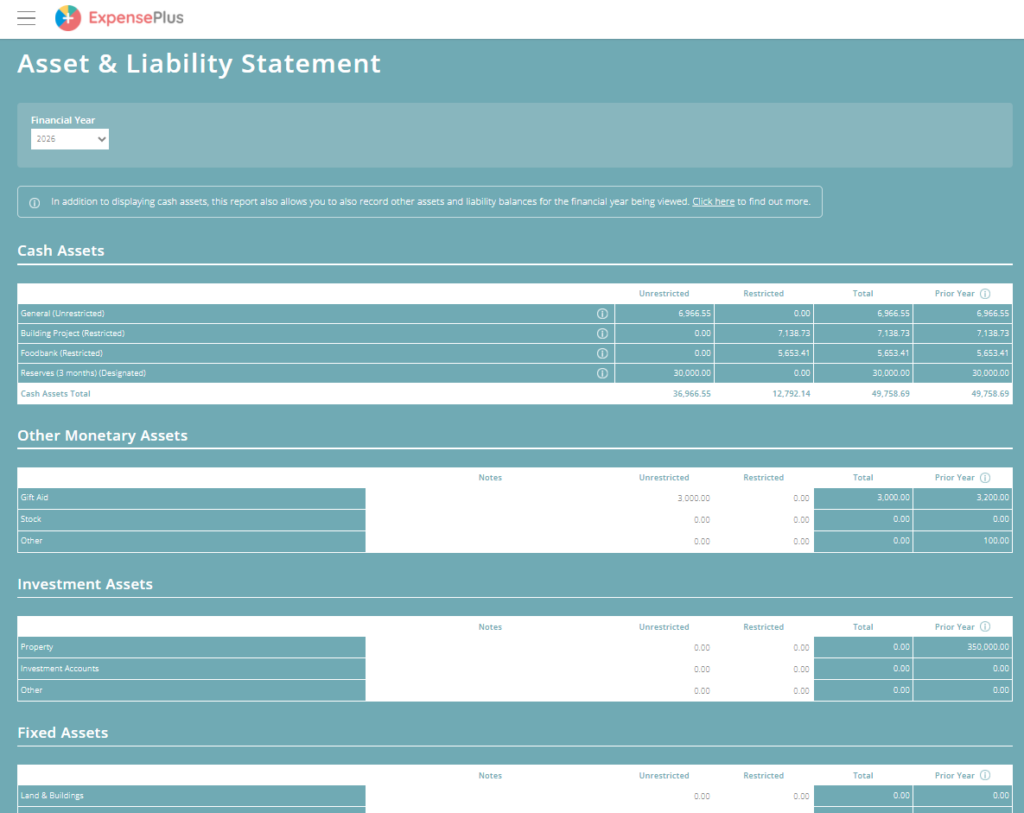 This report gives a snapshot of where your charity stands financially at a specific point in time – usually on the last day of your financial year.